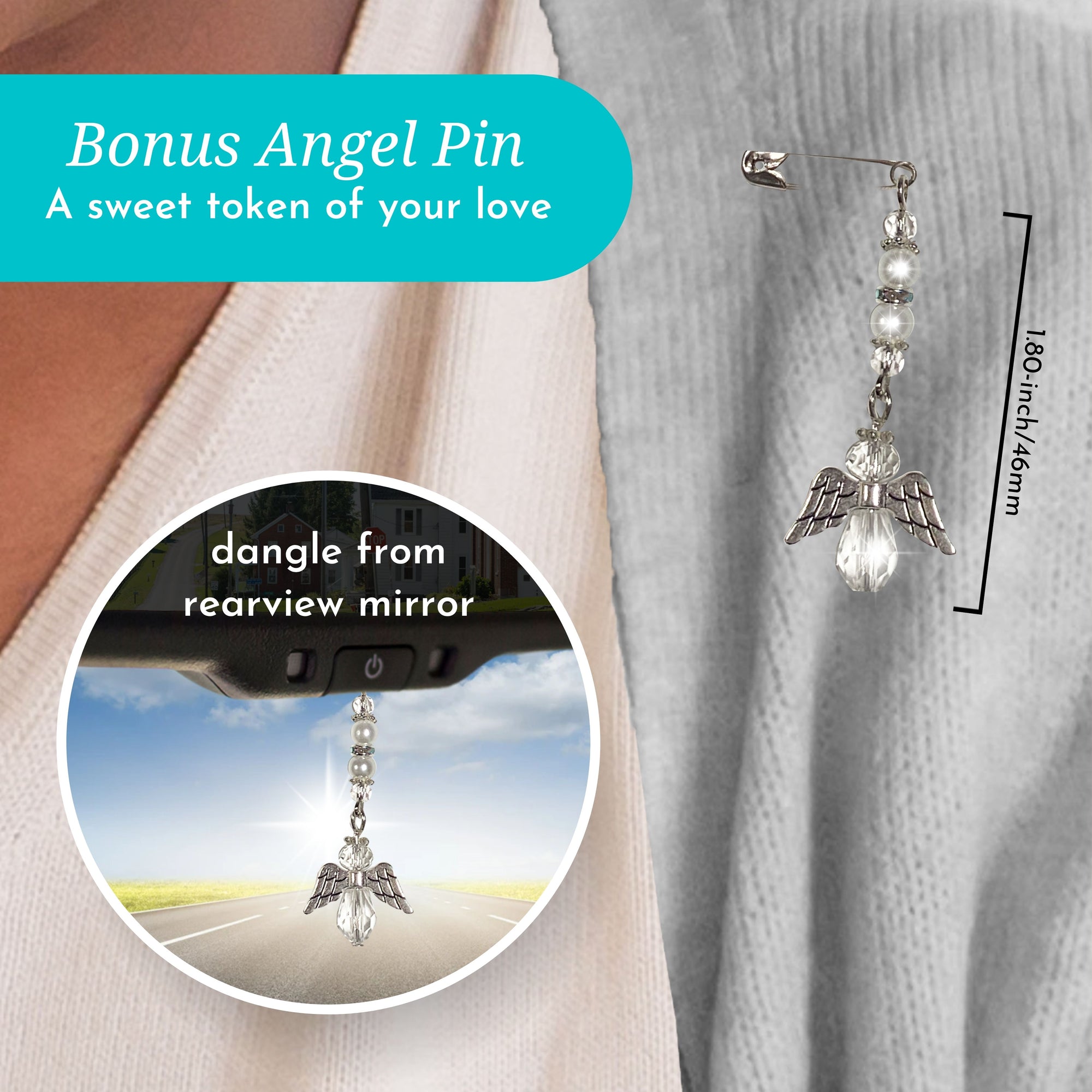 The included card shares the symbolism of the angel charm, reminding the recipient they are never alone. You’ll also find a heart-notecard to write a personal message of support or prayer.