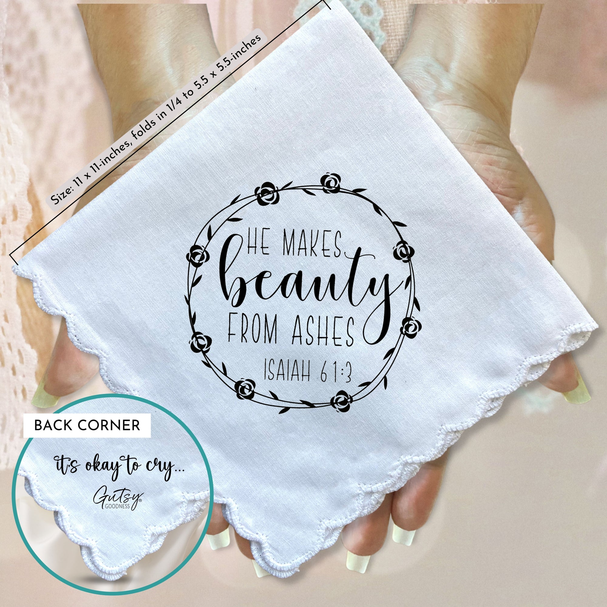 Printed with the powerful message *“He makes beauty from ashes”* on a scalloped-edge cotton-linen handkerchief. A heartfelt encouragement gift for those walking through loss, healing, or new beginnings.