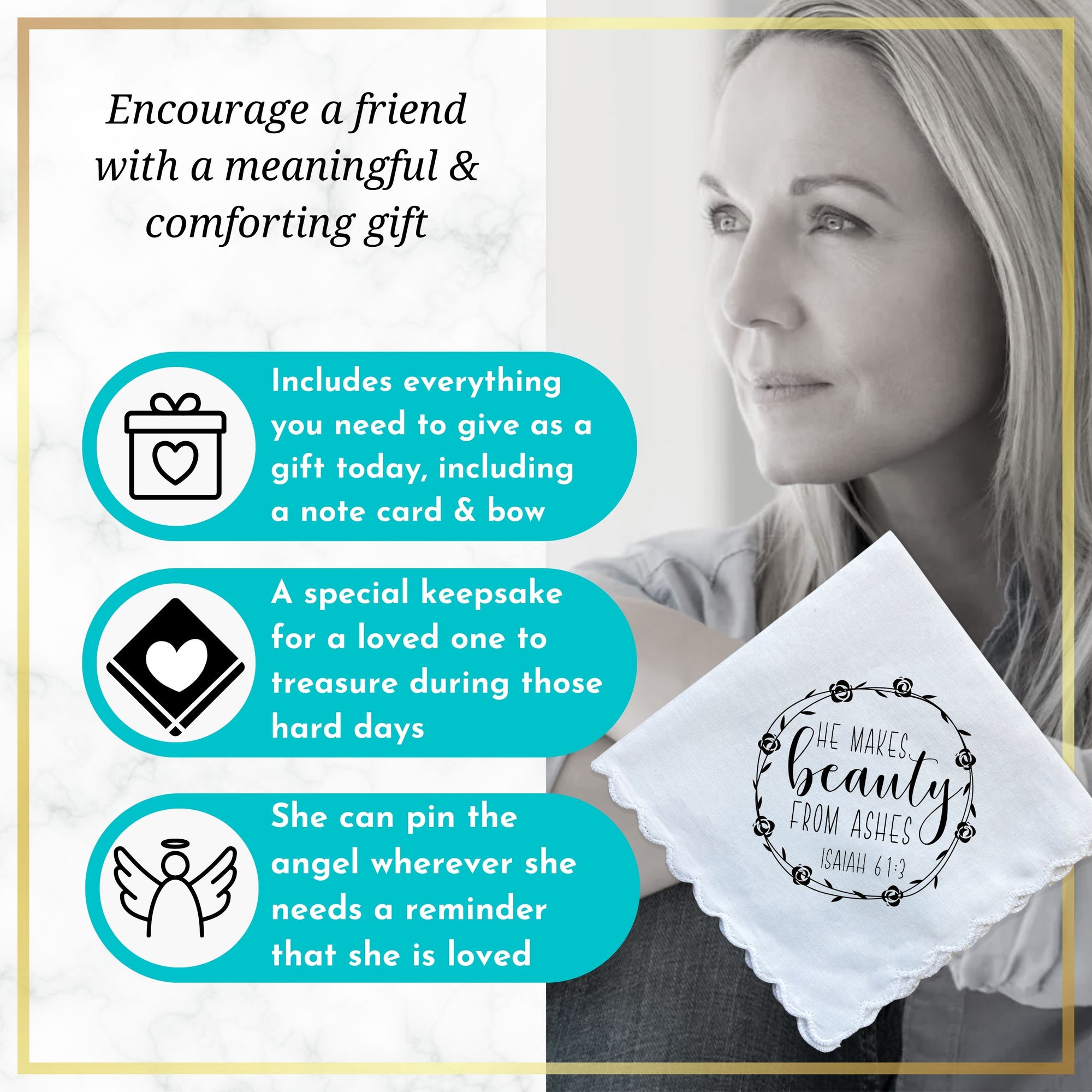 He Makes Beauty From Ashes Thinking of You Handkerchief | Bible Verse Christian Encouragement Gift for Friend | Angel Charm Card & Envelope