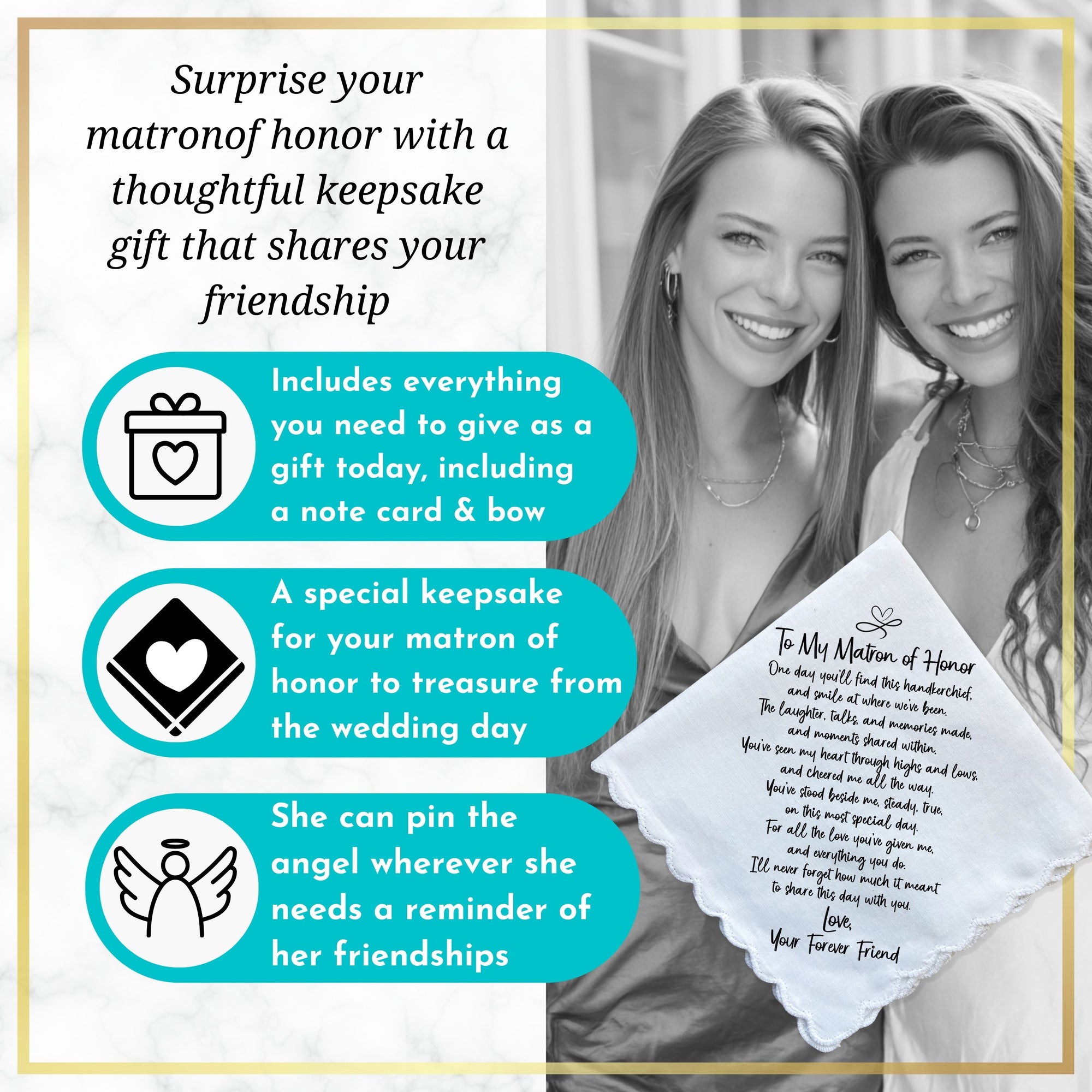 Matron of Honor Handkerchief Wedding Gift from Bride | Thank You Keepsake Poem for Morning of Letter, Angel Charm, Card, Unique Envelope