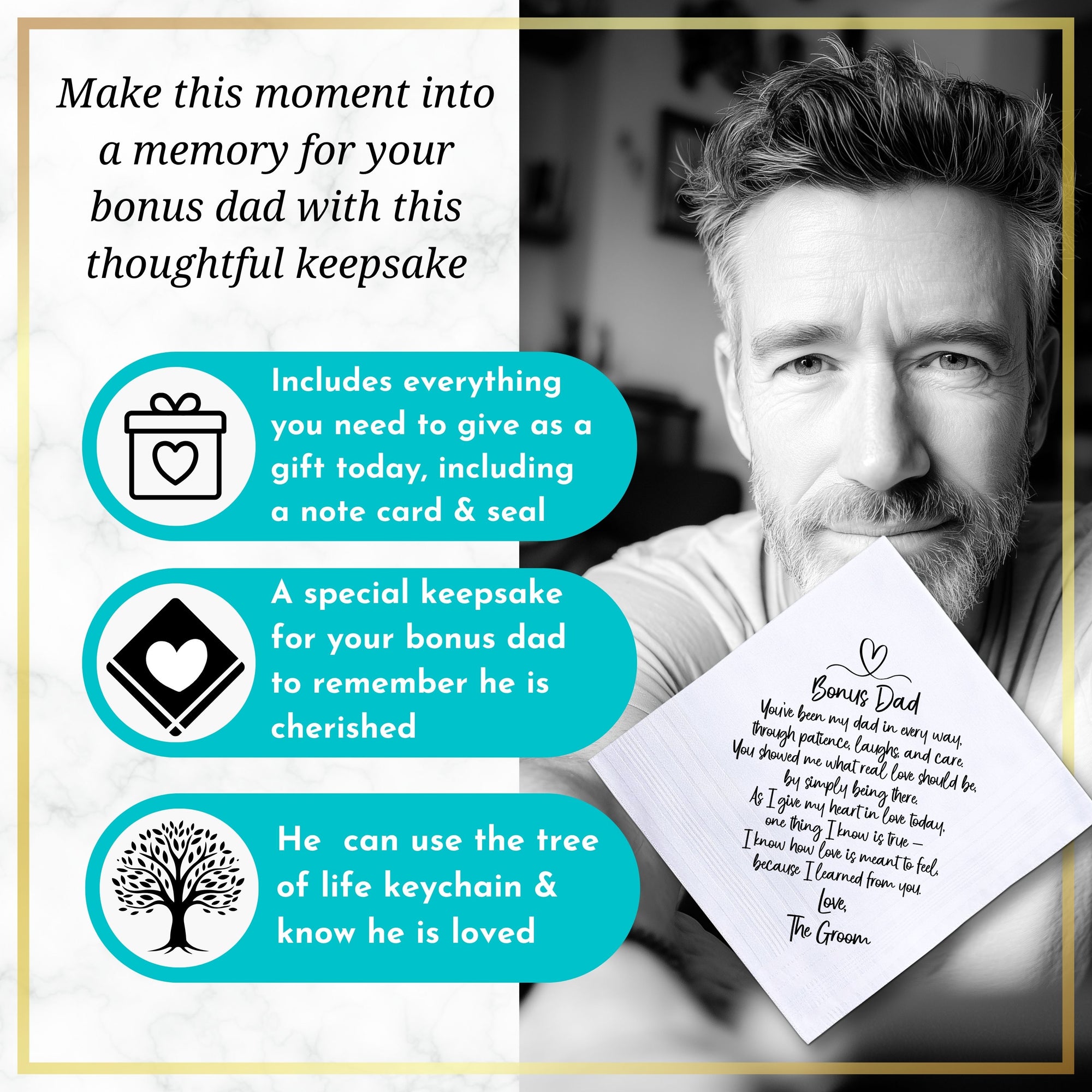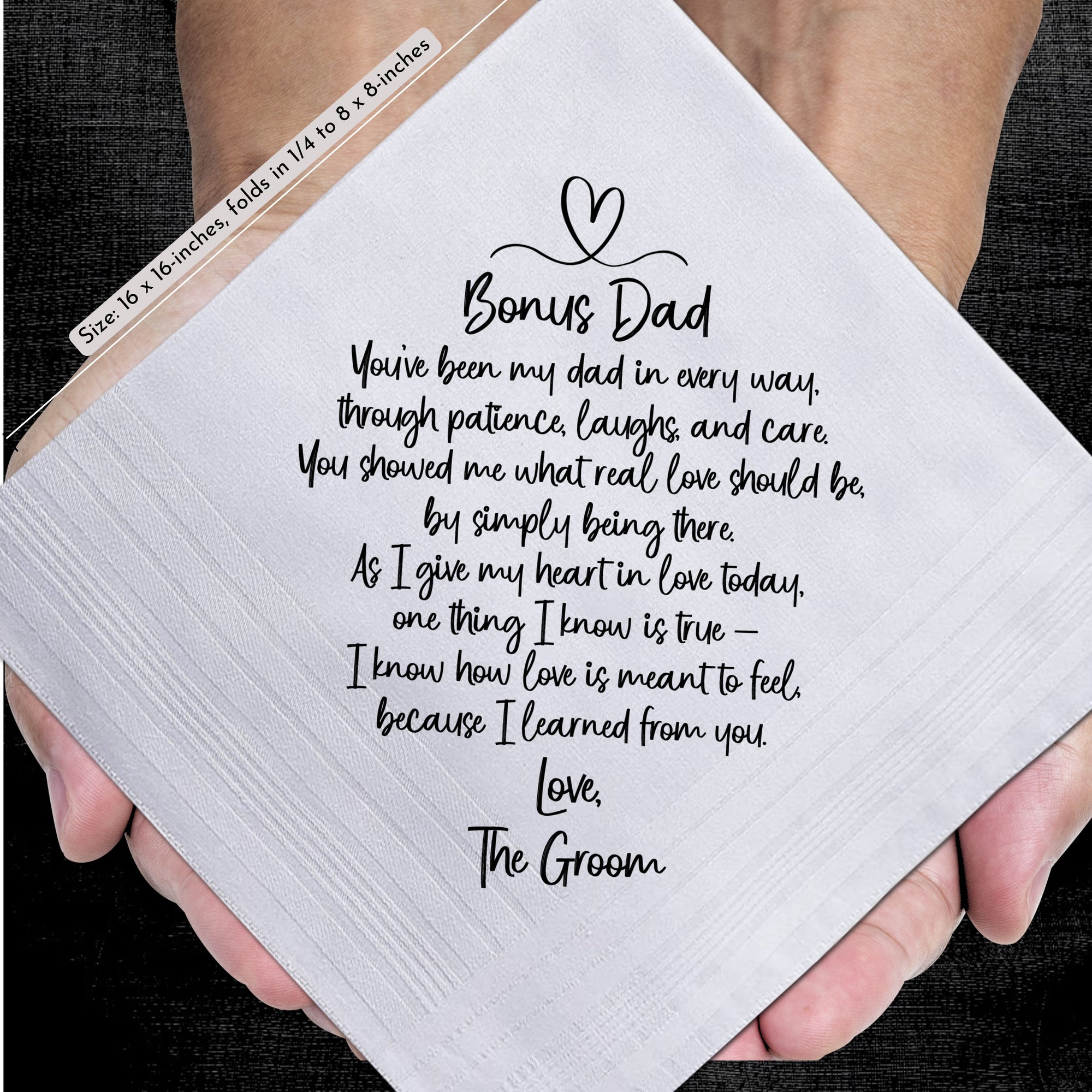 Professionally printed on a white cotton hankie using heat-press technology so it won’t smudge or fade, this poem from groom to stepdad is a tribute to your bond and the journey you’ve shared.