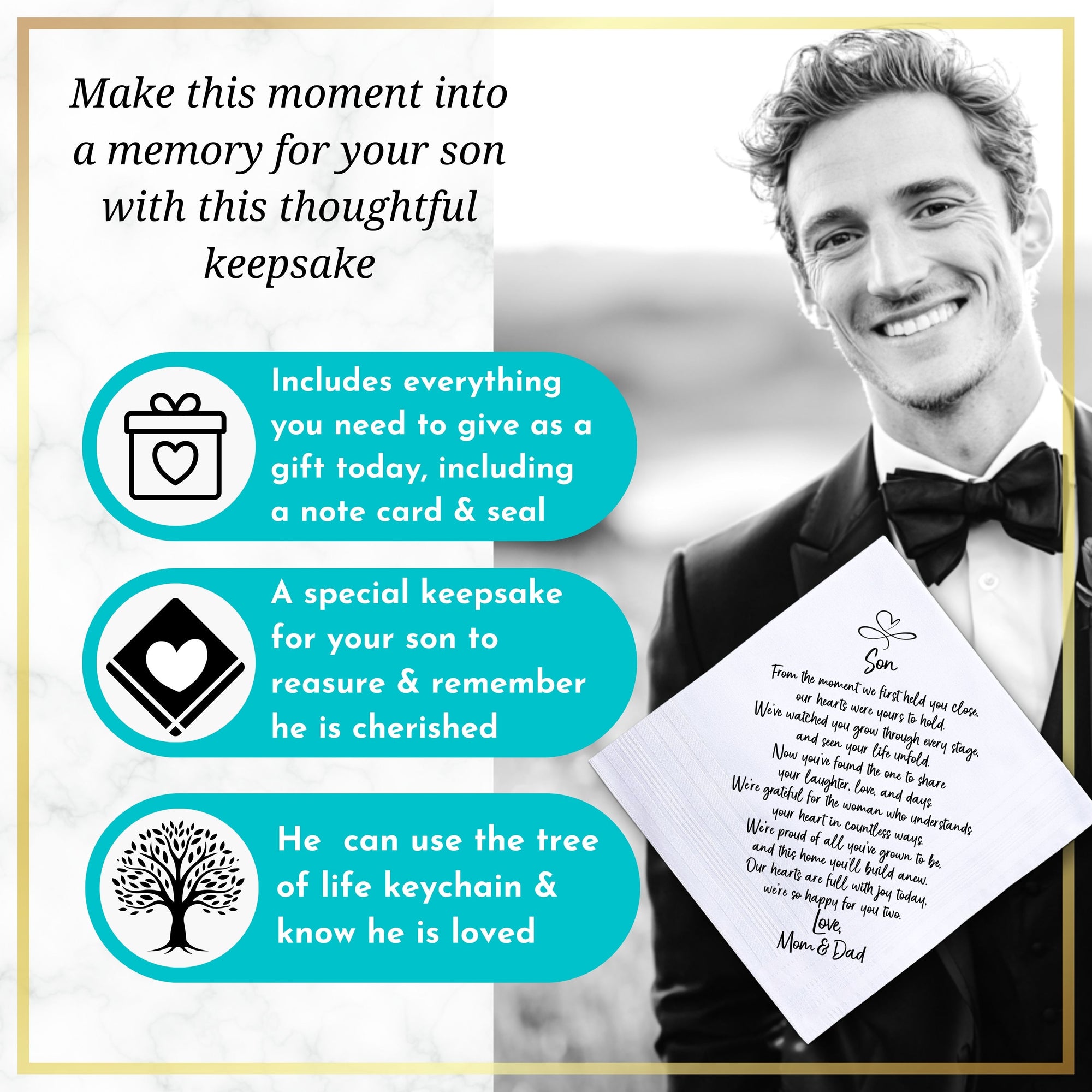 A classic wedding day item printed with a loving poem from mom and dad to their son—expressing the kind of support and pride that only parents can offer on such a momentous day.